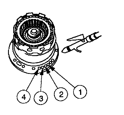 12. Check the following passages of the forward/coast/direct clutch cylinder and reverse clutch drum with moisture-free compressed air, regulated to 276 kPa (40 psi).