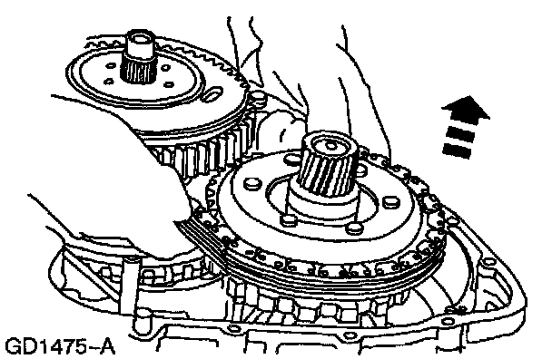 39. Separate the drive chain assembly from the driven sprocket assembly and reverse/overdrive ring gear assembly.