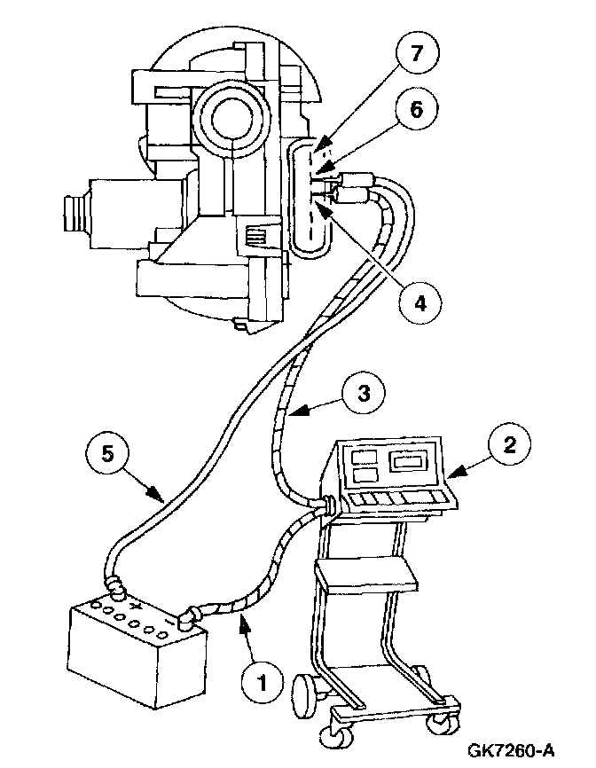 Disconnect the wiper motor. Connect the (1) green lead from (2) Alternator, Regulator, Battery and Starter Tester (ARBST) to the battery negative (-) post. Connect the (3) red lead from ARBST to the wiper motor (4) common brush terminal (terminal 3).