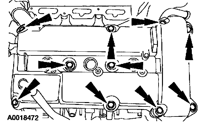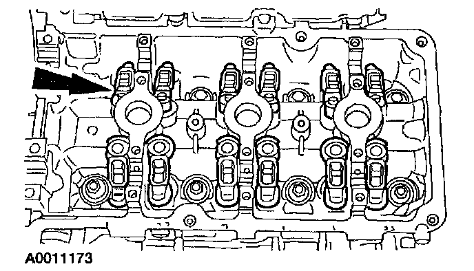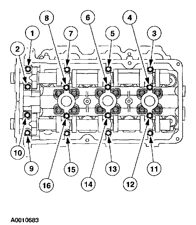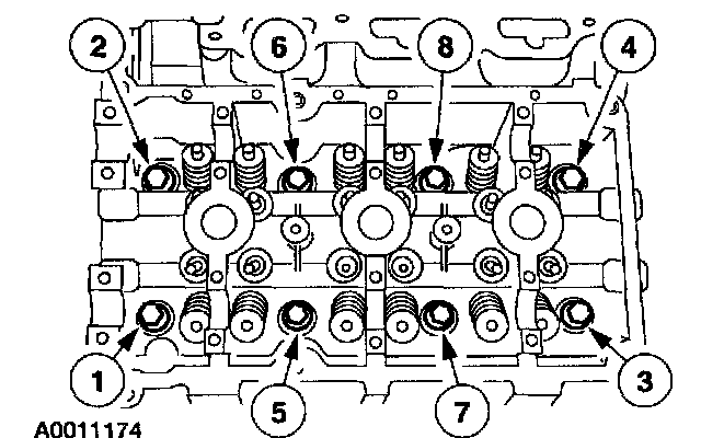 46. Loosen the LH and RH camshaft cap bolts in the indicated sequence and remove the camshaft caps.