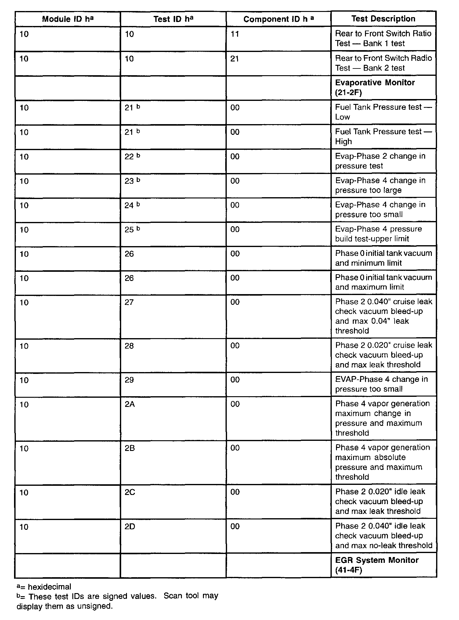 The purpose of this test mode is to allow access to the results of OBD II monitor diagnostic test results. The test values that are stored at the time of the particular monitor completion are displayed when the particular test identification is requested. Refer to the table for test information.