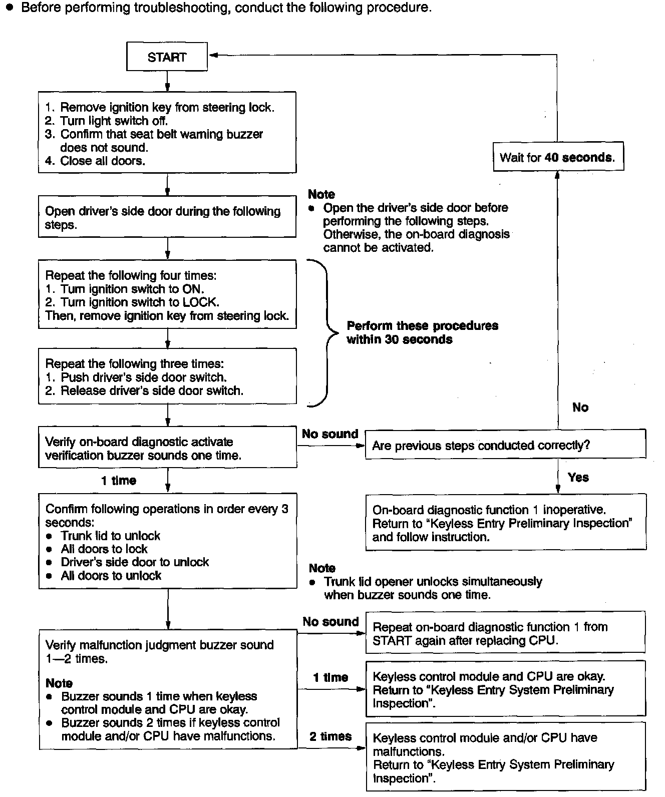KEYLESS ENTRY SYSTEM ON-BOARD DIAGNOSTICThere are two functions for the keyless entry system on-board diagnostic (OBD). OBD function 1 tells the keyless control module and CPU to activate the power door lock and trunk lid opener systems without the transmitter. OBD function 2 monitors a keyless entry demand signal sent from the transmitter and used inside the keyless control module. OBD function 2 diagnoses the transmitter, integrated antenna and the keyless control module.