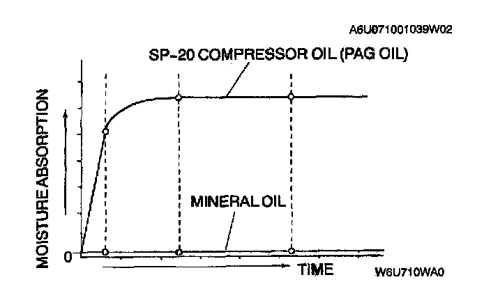 - SP-20 compressor oil (PAG oil) has a higher moisture absorption efficiency than the previously used mineral oil. If moisture mixes with the compressor oil, the refrigerant system could be damaged. Therefore, install caps immediately after using the compressor oil or removing refrigerant system parts to prevent moisture absorption.