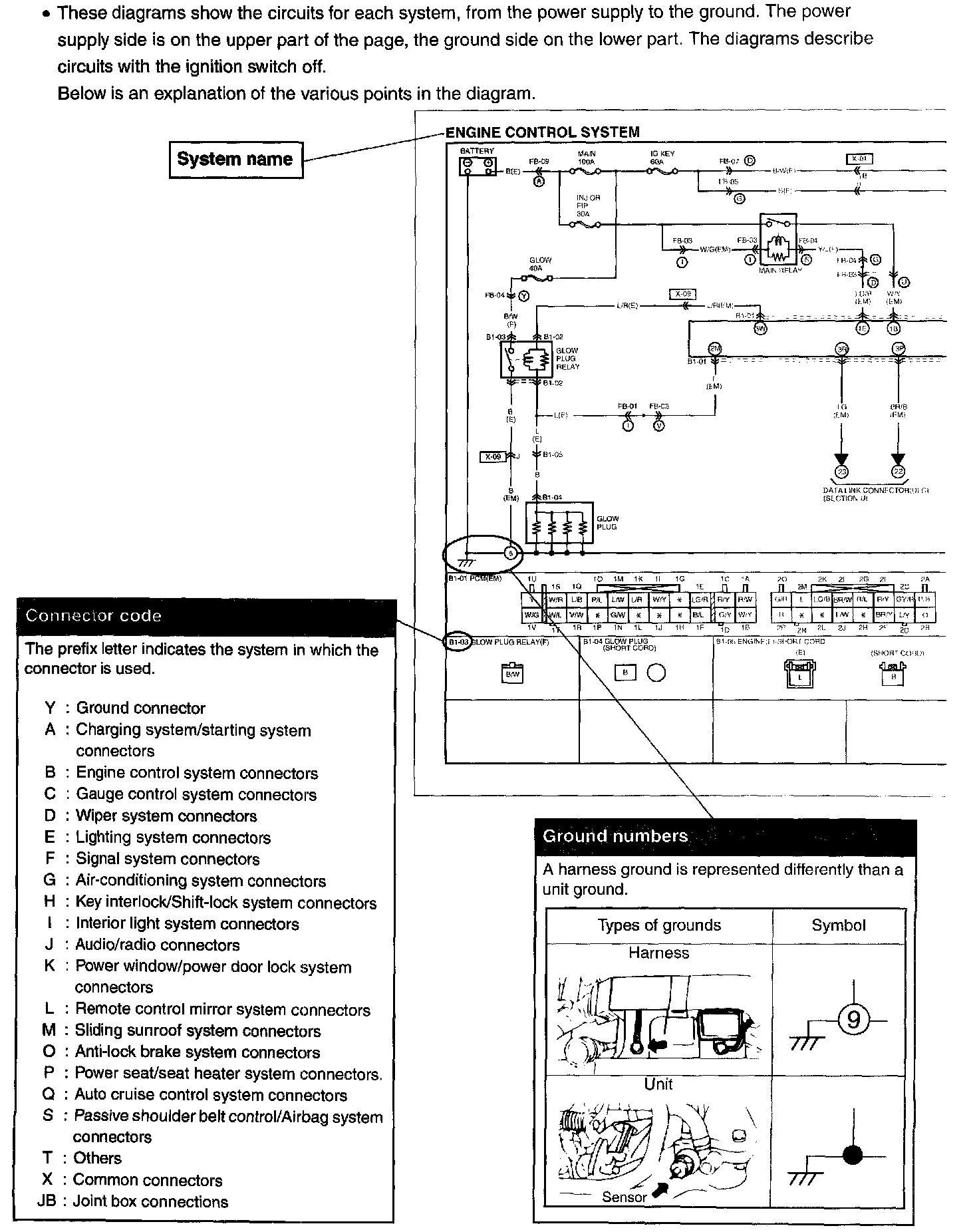 These diagrams show the circuits for each system, from the power supply to the ground. The power supply side is on the upper part of the page, the ground side on the lower part. The diagrams describe circuits with the ignition switch off.