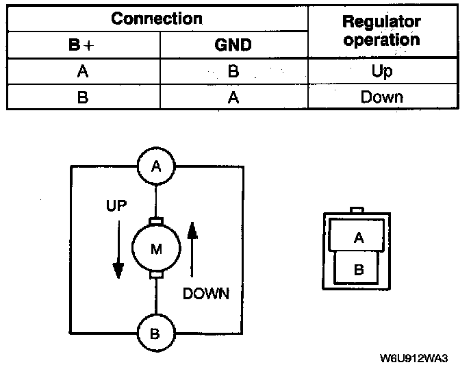 5. Apply battery positive voltage to the front power window regulator terminals and check the operation of the front power window regulator.