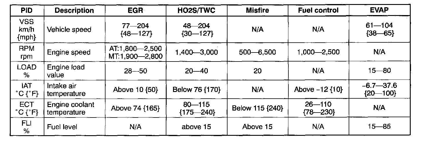 Drive Mode Implementation ConditionEach OBD II system is monitored (for less than 1 minute) when the specifications below are met.