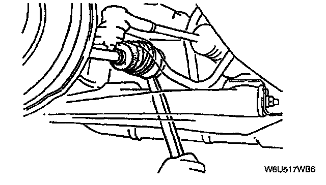 4. Separate the passenger side drive shaft from the transaxle by prying with a bar inserted between the outer ring and the transaxle, as shown in the figure.
