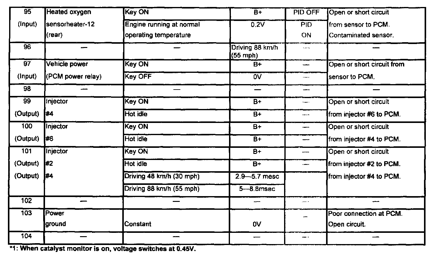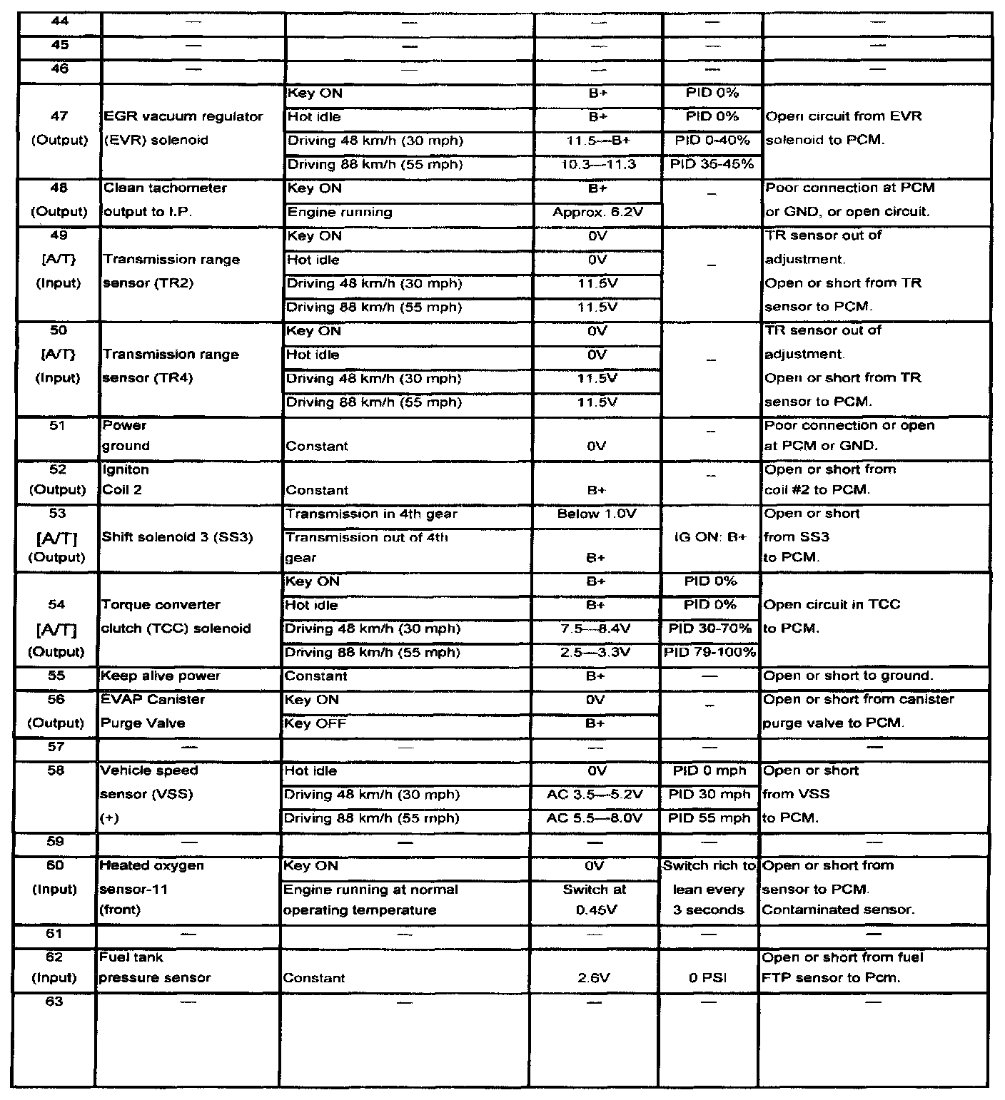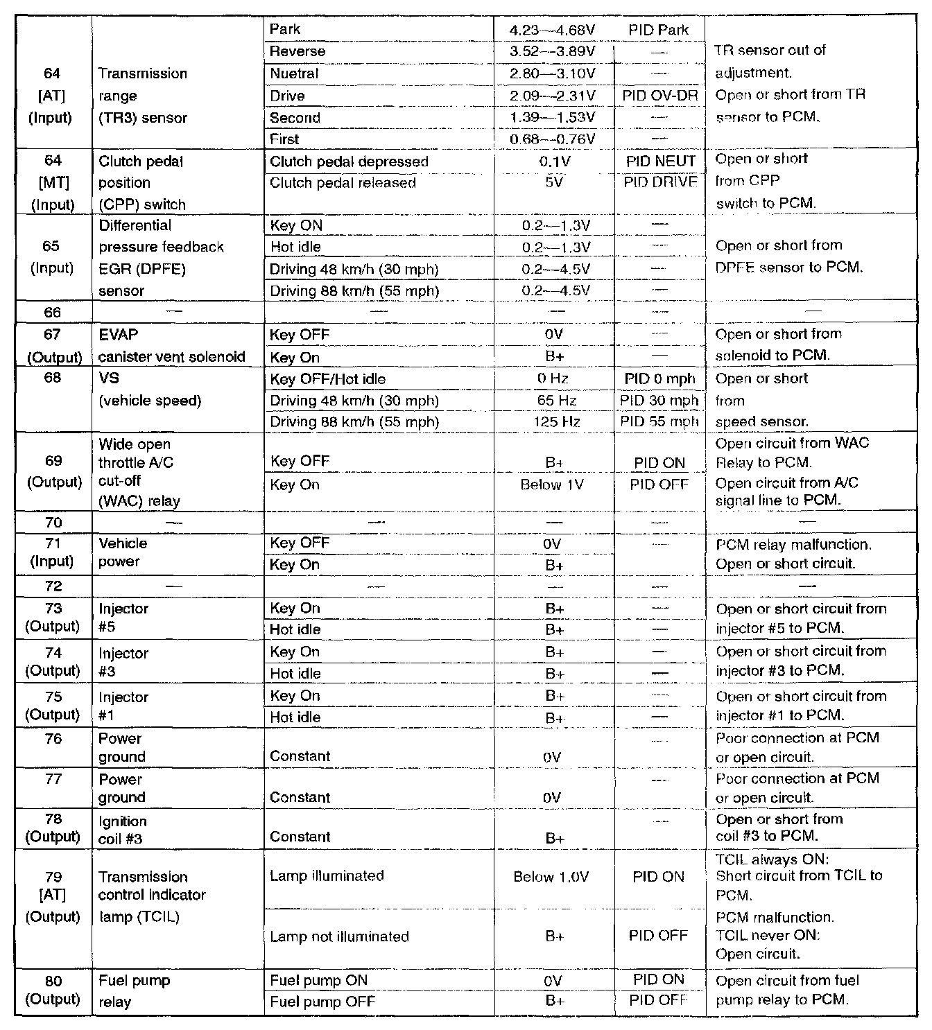 POWERTRAIN CONTROL MODULE (PCM) INSPECTIONCAUTION: The PCM terminal voltages vary with change in measuring conditions and vehicle conditions. Always carry out a total inspection of the input systems, output systems, and PCM to determine the cause of trouble. Otherwise, a wrong diagnosis will be made.