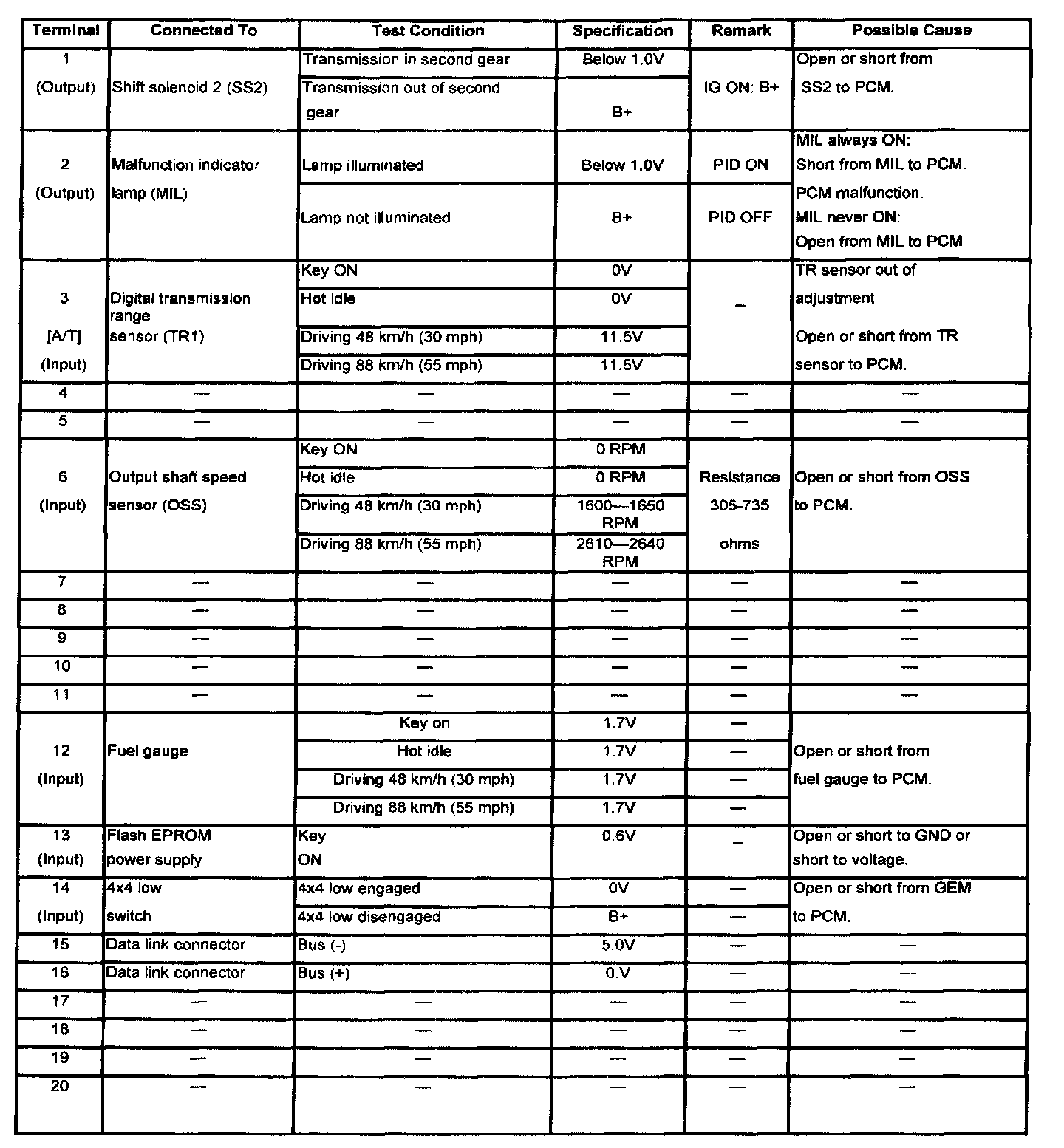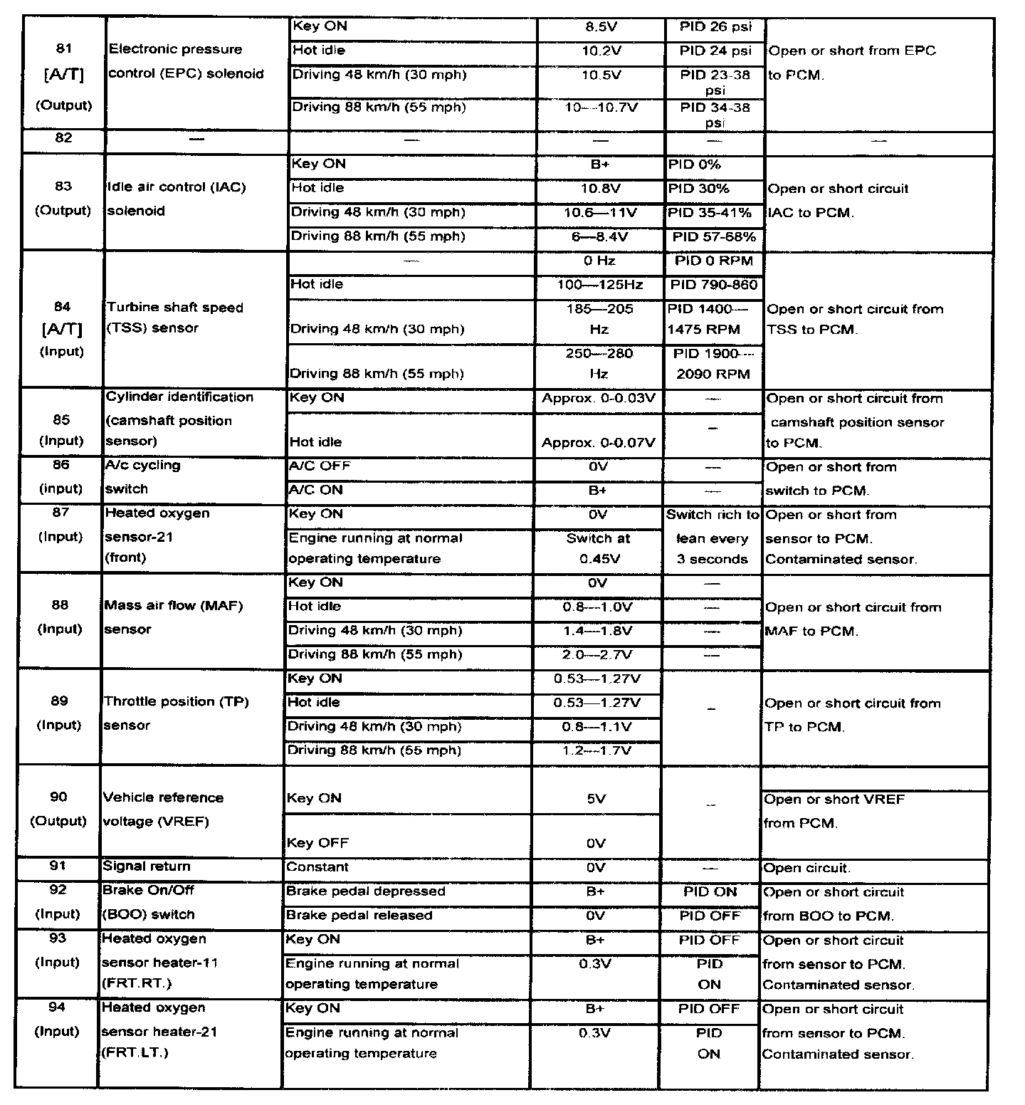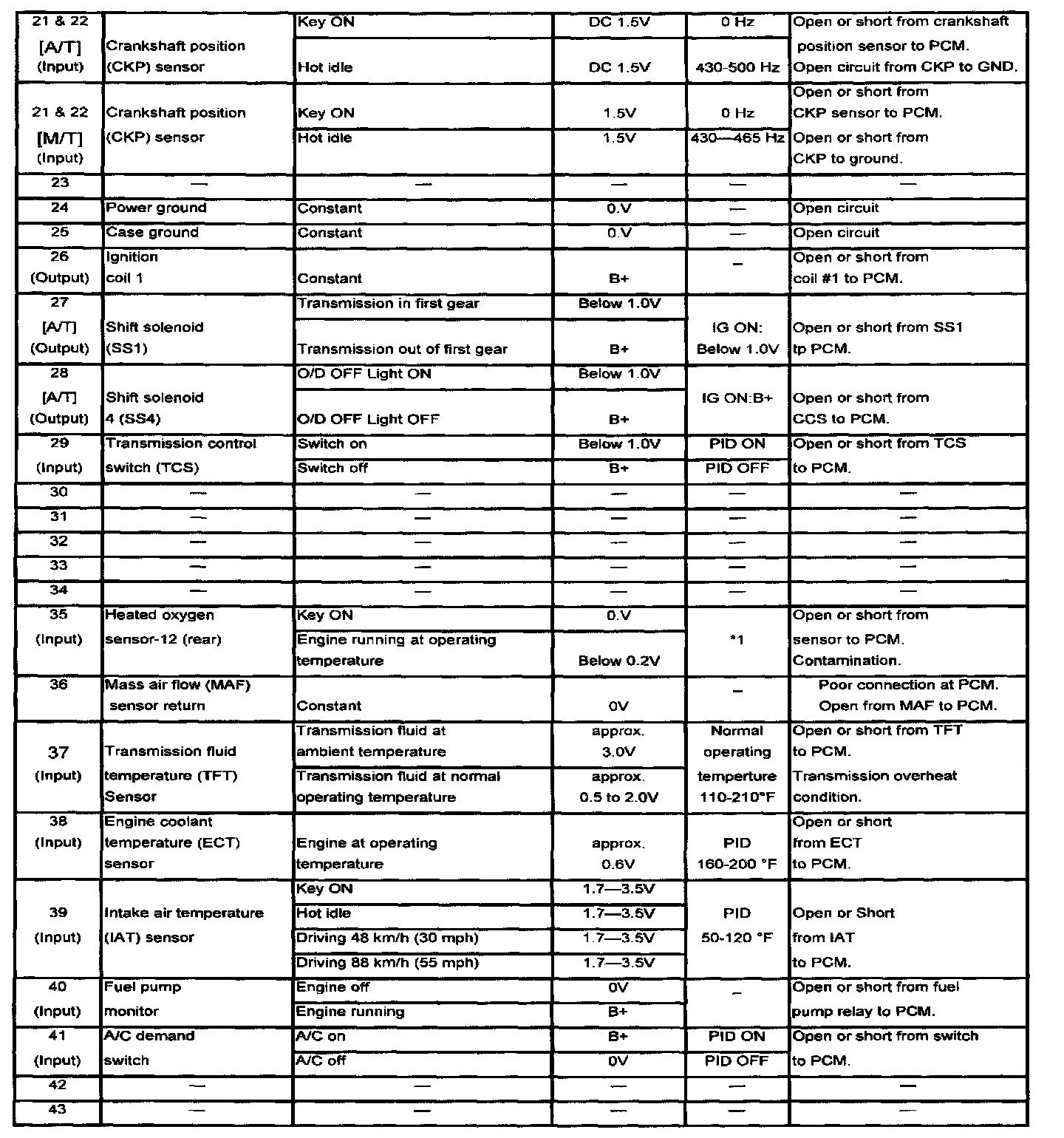 POWERTRAIN CONTROL MODULE (PCM) INSPECTIONCAUTION: The PCM terminal voltages vary with change in measuring conditions and vehicle conditions. Always carry out a total inspection of the input systems, output systems, and PCM to determine the cause of trouble. Otherwise, a wrong diagnosis will be made.