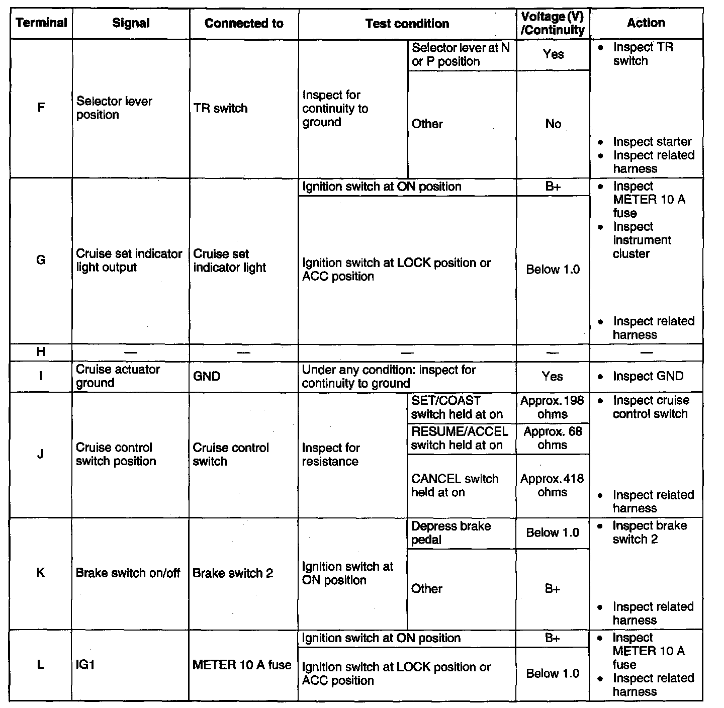Terminal Voltage Table (Reference) - Terminal (F - L):