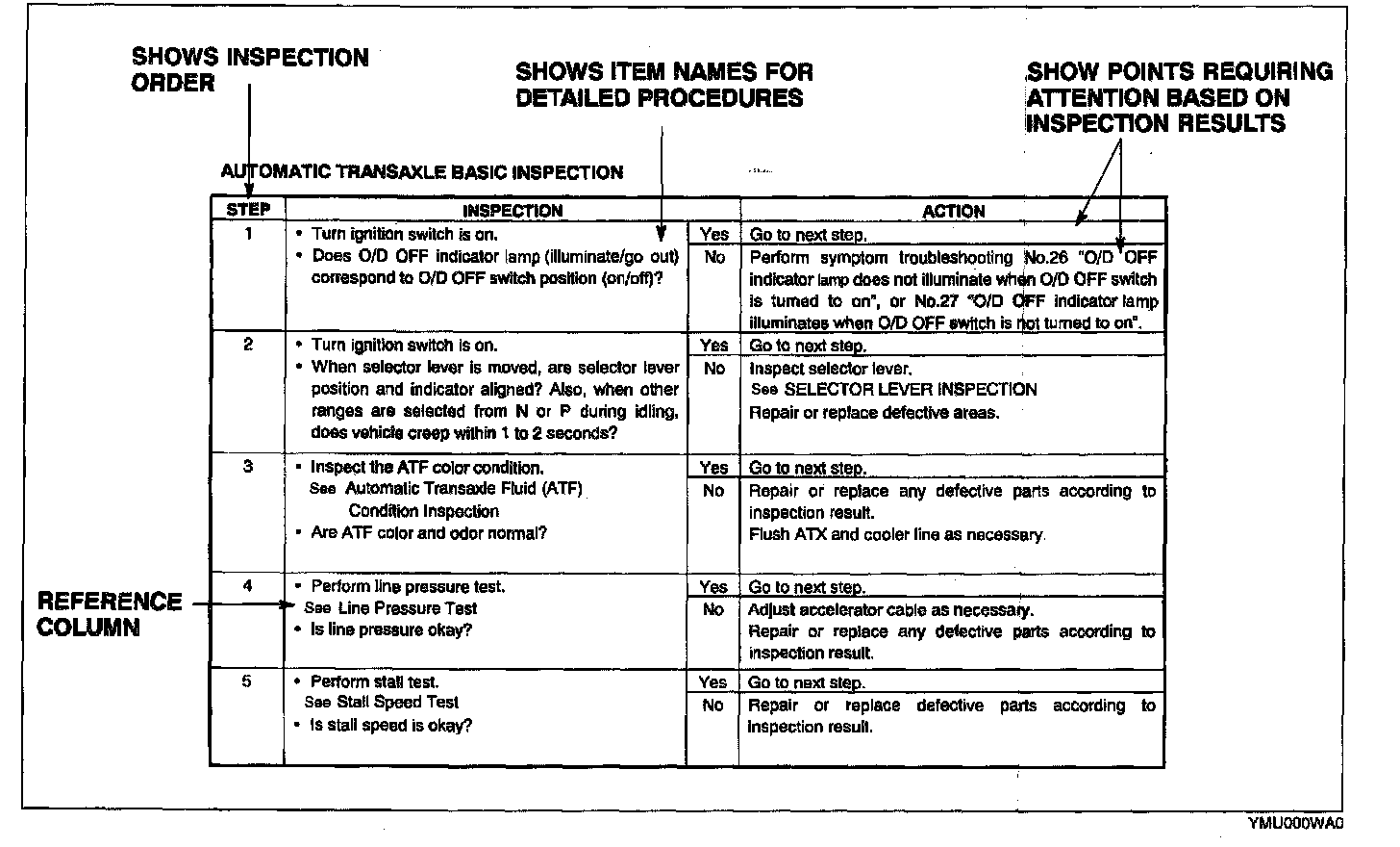 - Although inspections and adjustments are performed according to the reference column procedures, if the cause of the malfunction is discovered during basic inspection, continue the procedures as indicated in the remarks column.