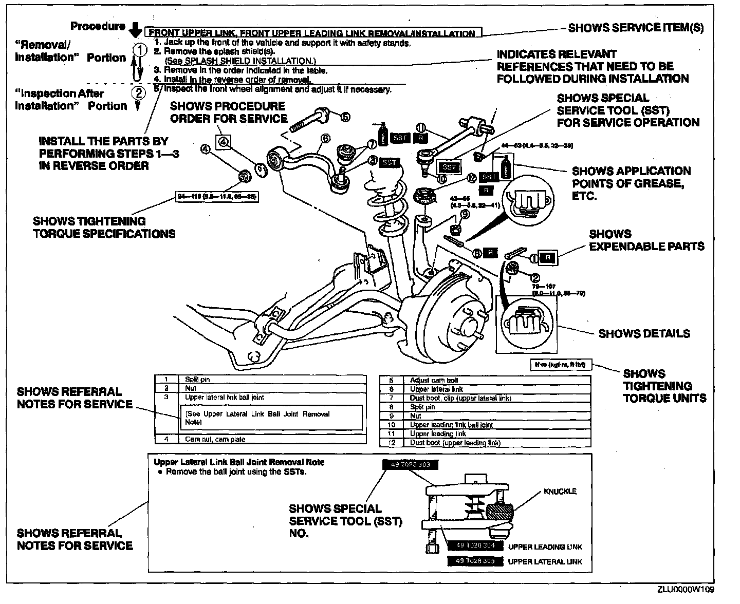 2. Expendable parts, tightening torques and symbols for oil, grease, and sealant are shown in the overview illustration. In addition, symbols indicating parts requiring the use of special service tools or equivalent are also shown.