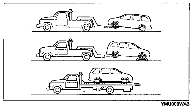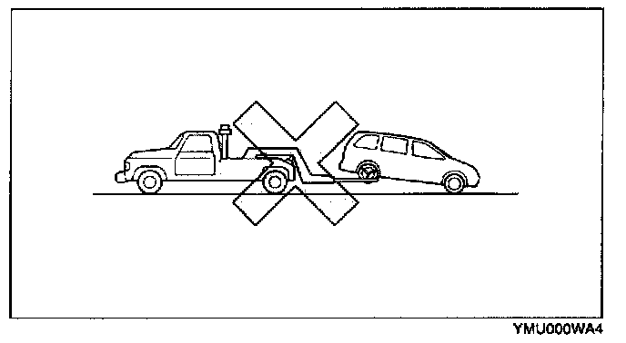 - Do not tow the vehicle backward with driving wheels on the ground. This may cause internal damage to the transaxle.
