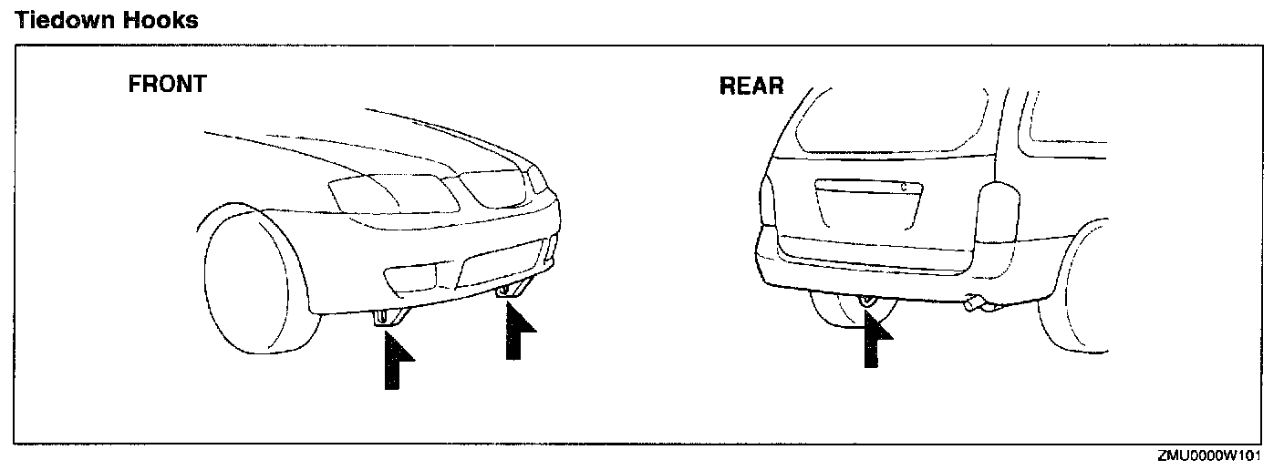 - Do not use the hook loops under the front and rear for towing. They are designed ONLY for tying down the vehicle when it is being transported. Using them for towing will damage the bumper.