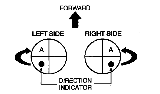 ^ Adjust the caster by turning the mounting block as shown so that the direction indicator is located at position A. If the direction indicator faces toward the inside of the vehicle, the camber and caster will be out of specifications.