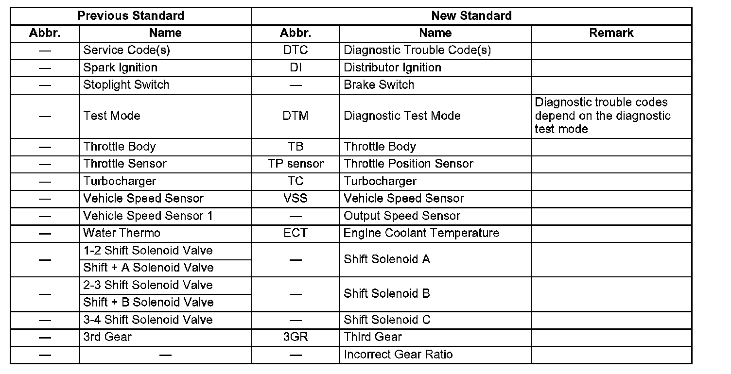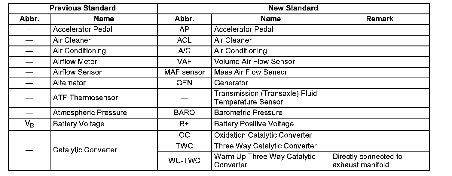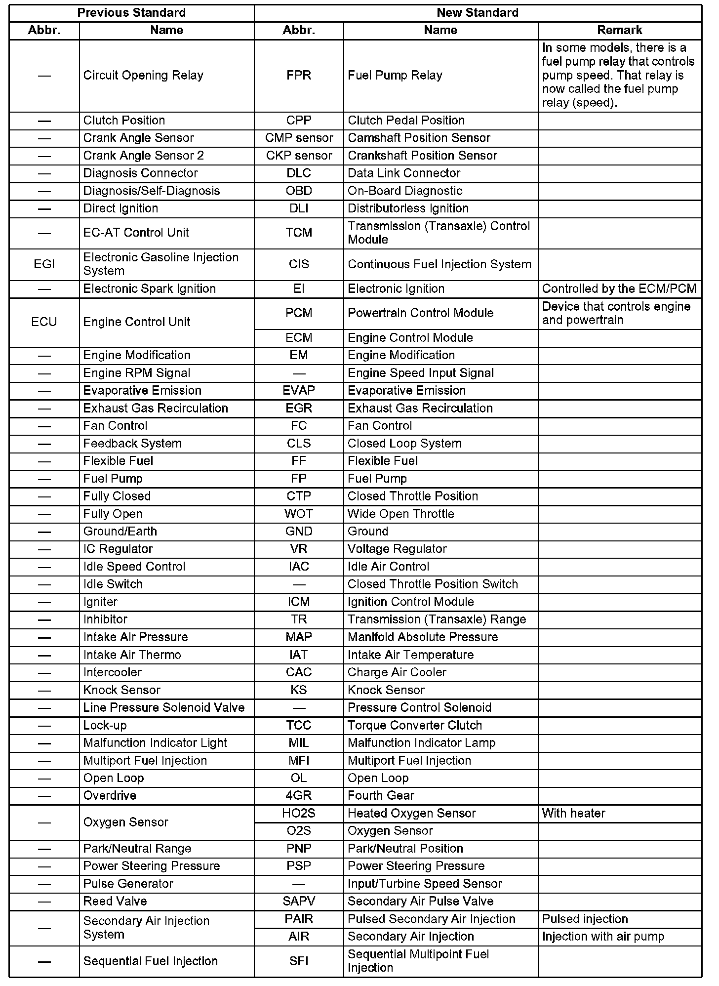 SAE STANDARDS^ In accordance with new regulations, SAE (Society of Automotive Engineers) standard names and abbreviations are now used in this information. The table below lists the names and abbreviations that have been used in Mazda information up to now and their SAE equivalents.