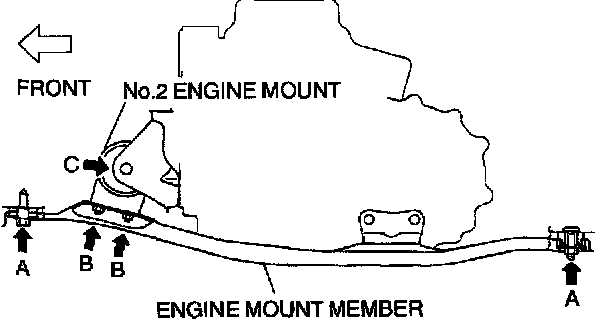 6. Tighten the No.2 engine mount nuts B and C.