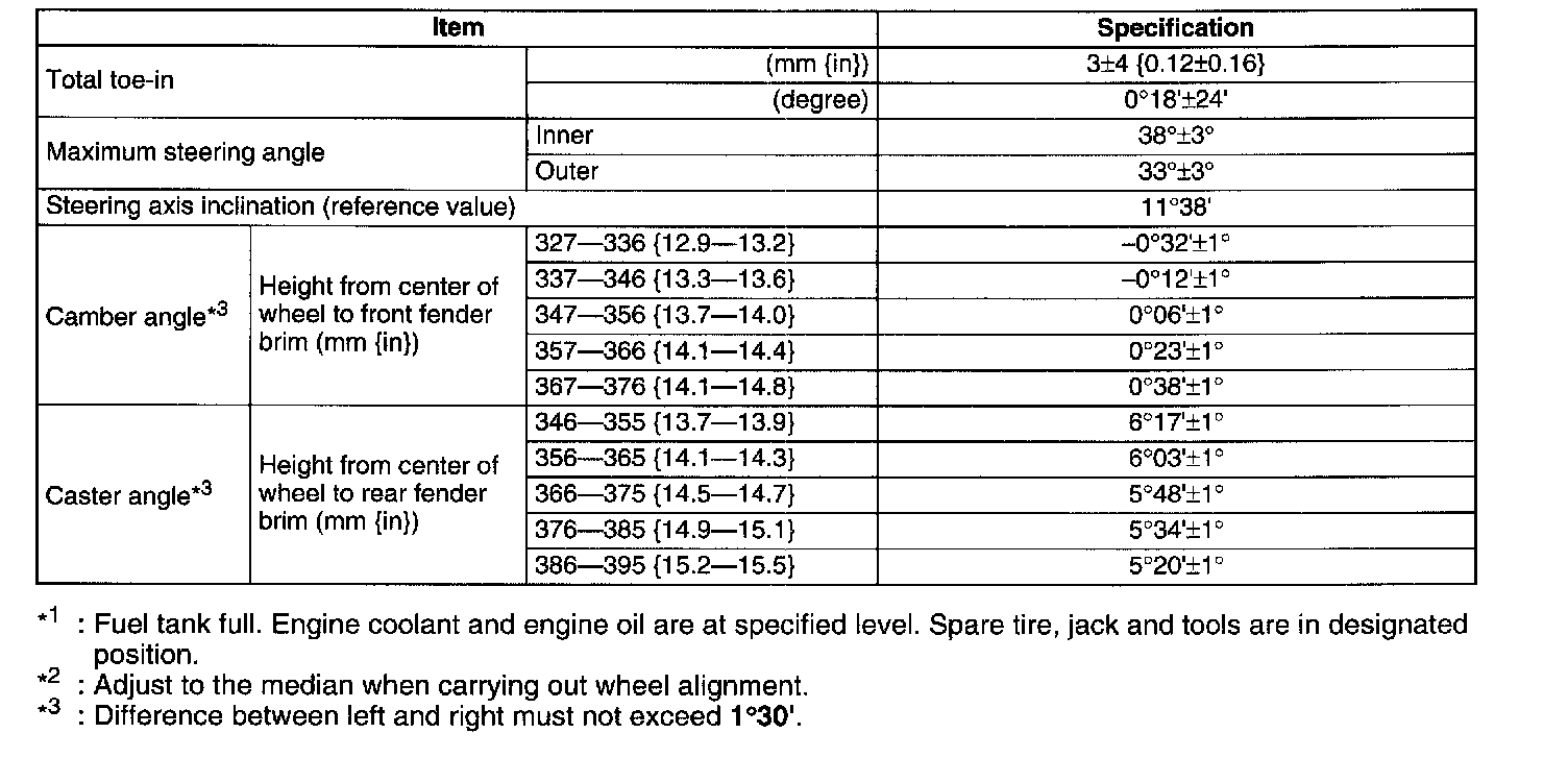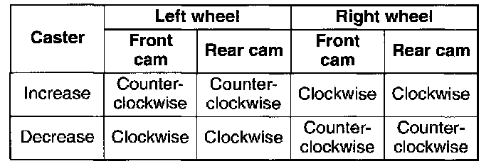 ^ Turning the front cam one graduation changes the camber about 29' and the caster about 25'. Turning the rear cam one graduation changes the camber about 2' and the caster about 25'.