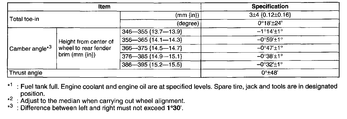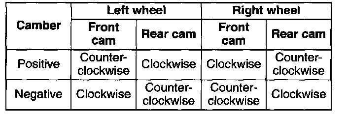 ^ Turning the front cam one graduation changes the camber about 13' and the toe-in about 2.3 mm (0.1 inch). Turning the rear cam one graduation changes the camber about 8' and the toe-in about 2.3 mm (0.1 inch).