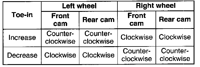^ If the cam cannot be turned far enough to make the adjustment, begin adjustment of the toe-in again using the other cam.