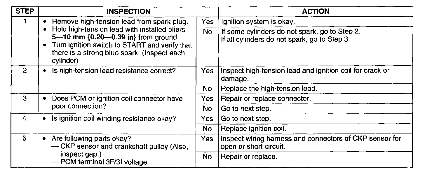 WARNING: High voltage in the ignition system can cause strong electrical shock which can result in serious injury. Avoid direct contact to the vehicle body during the above spark test.