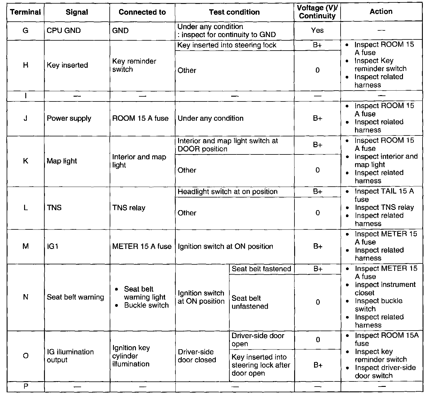 - If not as specified, inspect the parts listed under "Inspection area" and the related wiring harnesses.