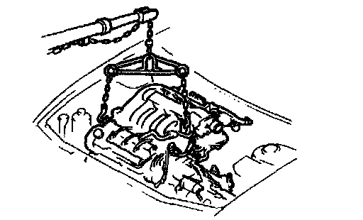 3. Slowly lower the engine and transaxle as a unit. Keep the engine from swinging or bumping into components it the engine compartment.