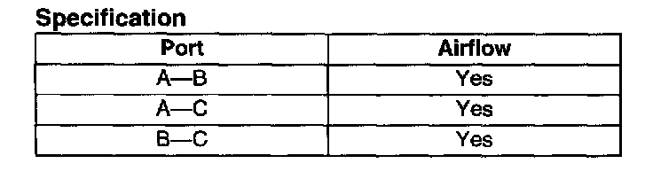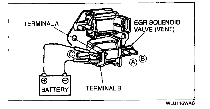 2. Apply battery positive voltage to terminal A and ground terminal B of the EGR solenoid valve (vacuum). Verify that air flows as shown.