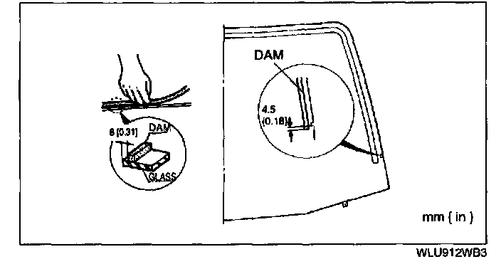 3. Securely bond a new dam along the top and sides 8 mm {0.31 in} from the edge of the glass as shown. Allow it to dry completely.