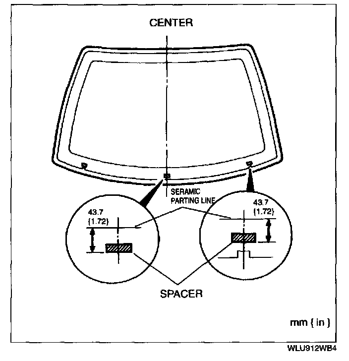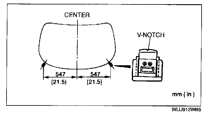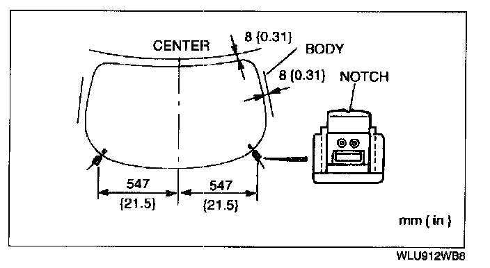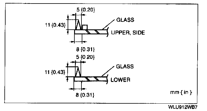 12. Press firmly on the glass to compress the sealant. Verify that the clearance between the top and sides of the glass and the body is 8 mm {0.31 in}.