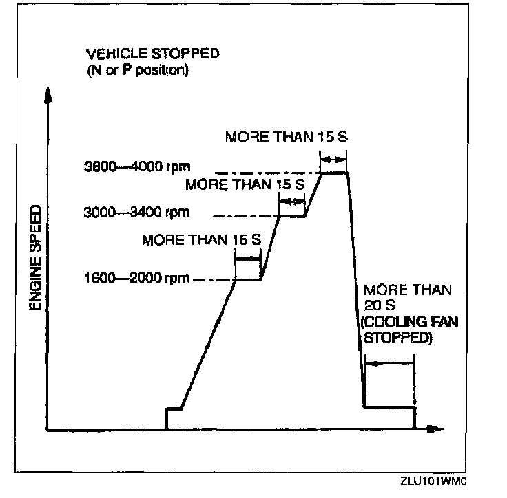 3. Perform no load racing at the engine speed shown in the graph, then idle the engine for more than 20 s after the cooling fan stopped. If possible, monitor RPM PID for engine speed and cooling fan status during this procedure.