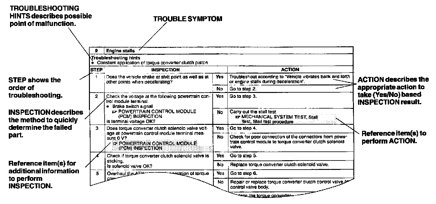 - Symptom troubleshooting shows diagnostic procedures, inspection methods, and proper action to take for each trouble symptom.