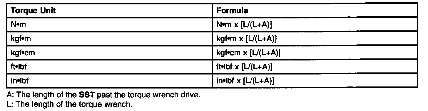 When using a torque wrench-SST combination, the written torque must be recalculated due to the extra length that the SST adds to the torque wrench. Recalculate the torque by using the following formulas. Choose the formula that applies to you.