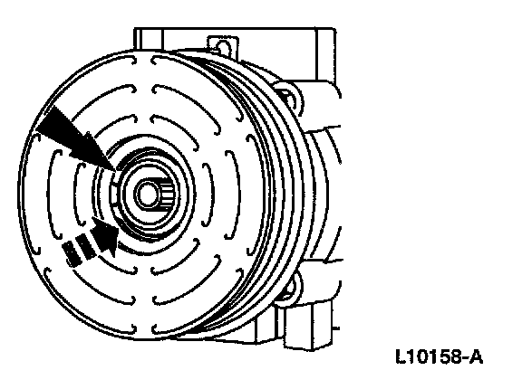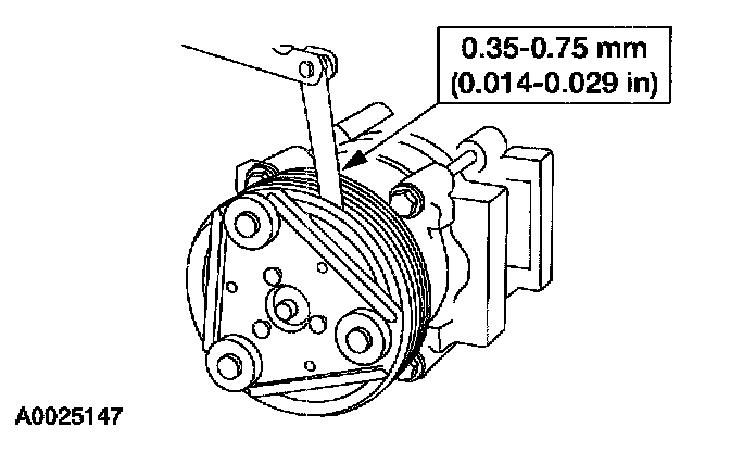 8. Measure and adjust the clutch air gap by removing or adding A/C clutch hub spacers.