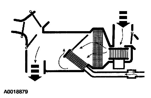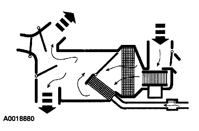 - The air inlet blend door, with no vacuum being applied, blocks recirculated air and allows outside air. Air flows through the system to the driver, passenger and center registers.