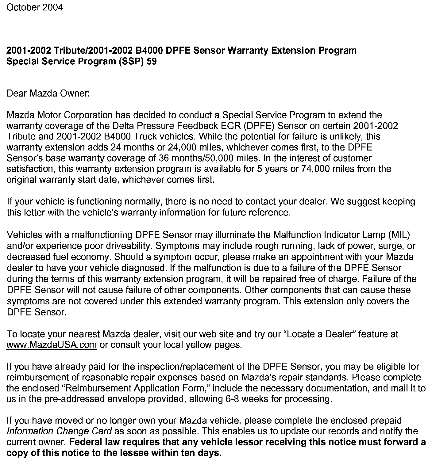 Recall - DPFE Sensor Replacement/Warranty Extension