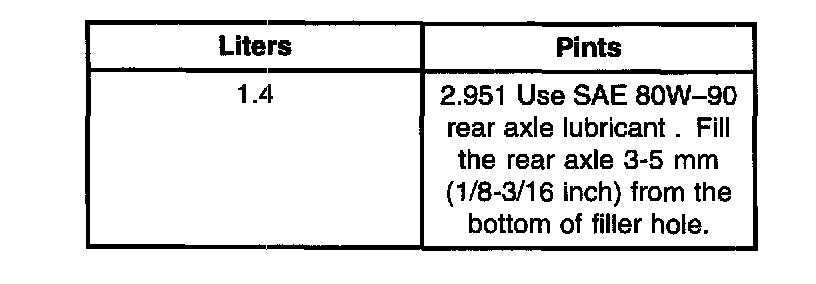 Use SAE 80W-9O rear axle lubricant. Fill the rear axle 3-5 mm (1/8-3/16 inch) from the bottom of filler hole.