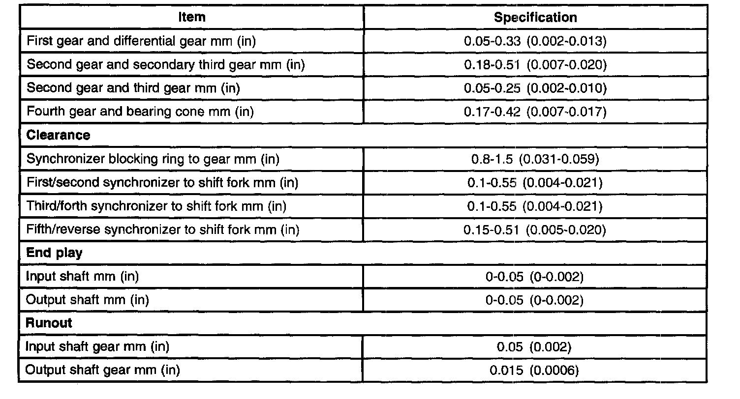 Fifth/reverse synchronizer to shift fork mm (in) 0.15 - 0.51 (0.005-0.020)