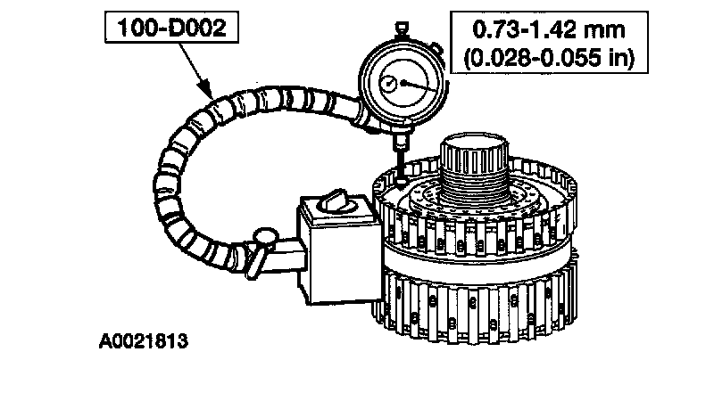 20. Make a second measurement on the opposite side. Average the two measurements to get the clearance. If the clearance is not within the specification, select and install, using the special tool, the correct thickness direct clutch pressure plate retainer snap ring to obtain the standard clearance.