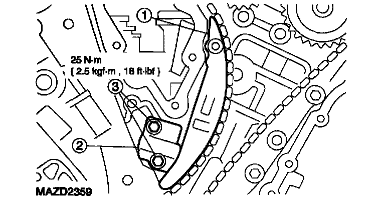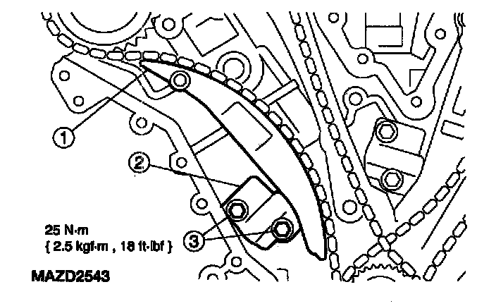 47. Install the RH timing chain guide and install the bolts.