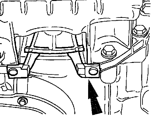 ^ Once the engine is supported by the engine crane, remove the bracket supporting the front of the engine.