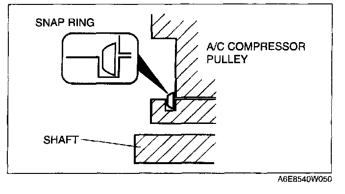 1. When installing a new pressure plate, A/C compressor pulley, stator, or A/C compressor body, replace the snap ring.