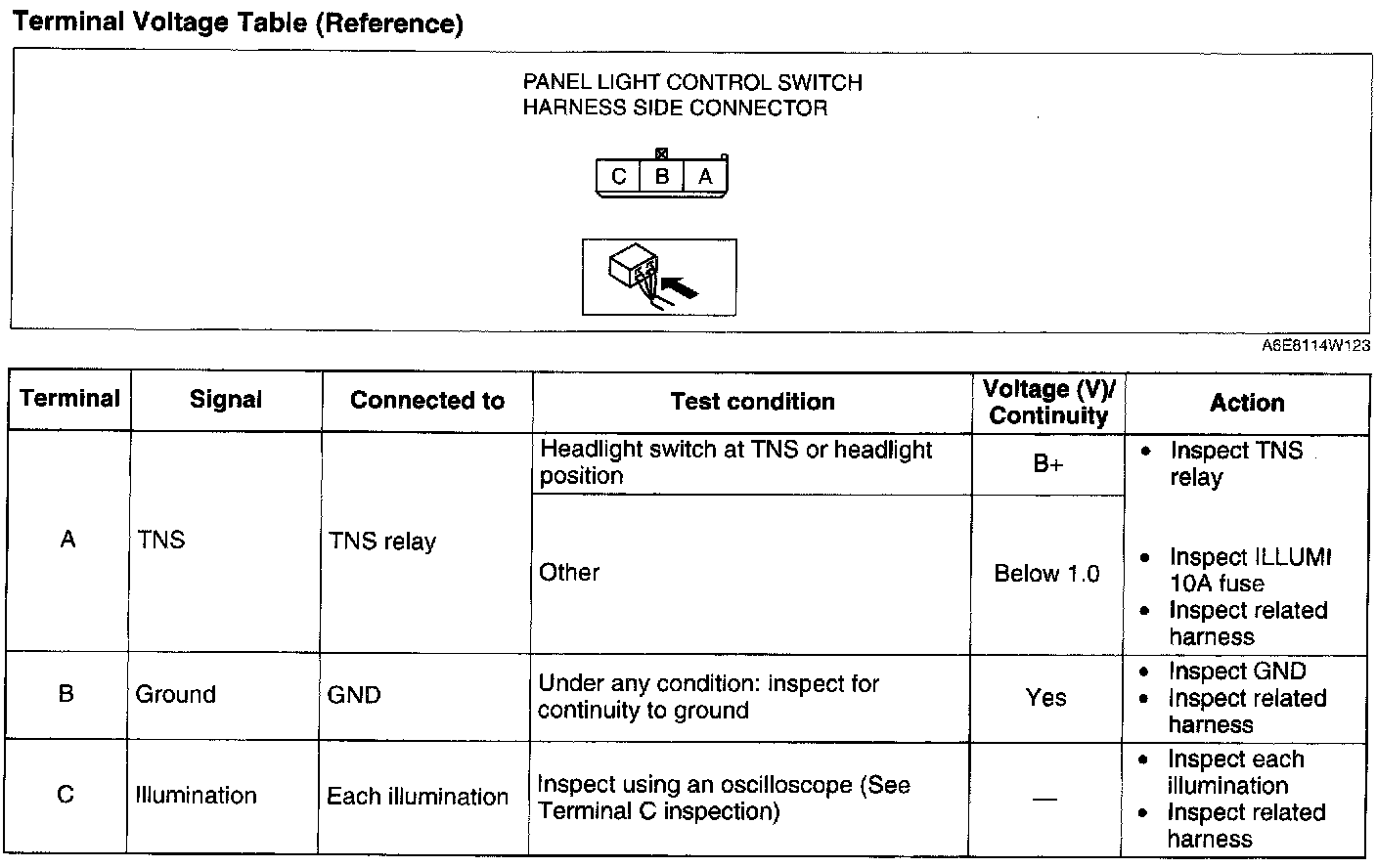 - When inspecting terminal B for continuity, disconnect the panel light control switch connector.