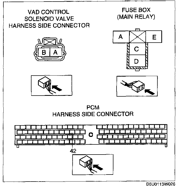 - VAD control solenoid valve terminal B (harness-side) and PCM terminal 42