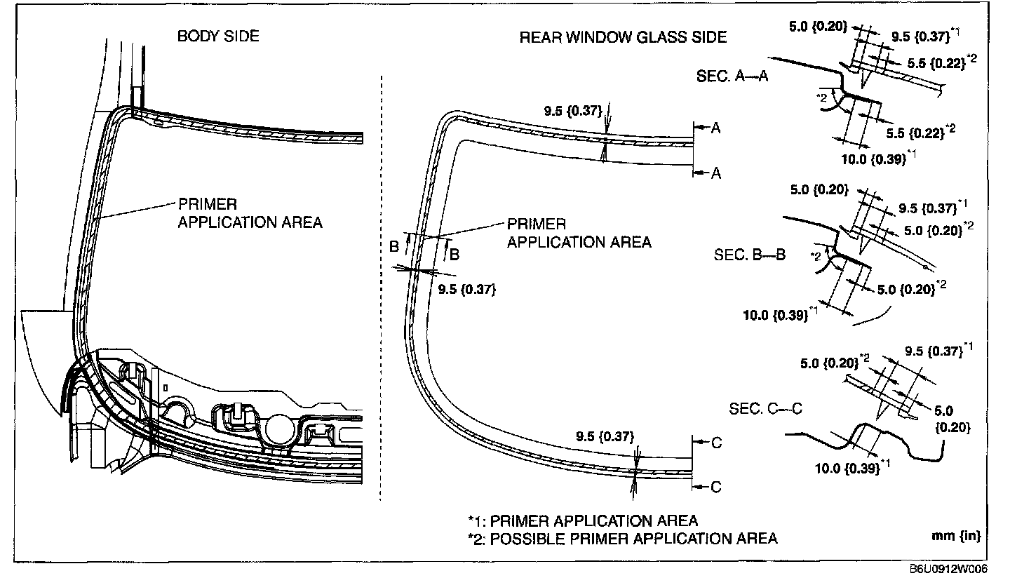 CAUTION: Keep the area free of dirt and grease, and do not touch the surface. Otherwise, the primer may not properly bond to the surface of the glass and body, which may cause leaks to occur.