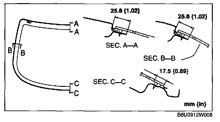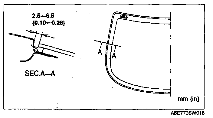 8. Verify that the gap of the upper part is 7.3 mm {0.29 in} and the A-pillar part is 6.8 mm {0.27 in}.