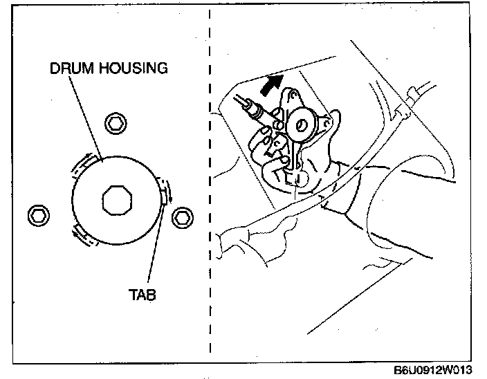 6. Insert hand through the speaker installation hole, rotate the regulator drum housing in the direction shown in the figure, and disengage the regulator drum housing from the door unit connection tabs.
