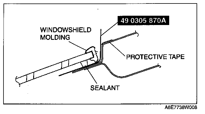 5. If installing reused glass, align the windshield molding marking and the center of the upper section of the windshield, then install the molding to the windshield.