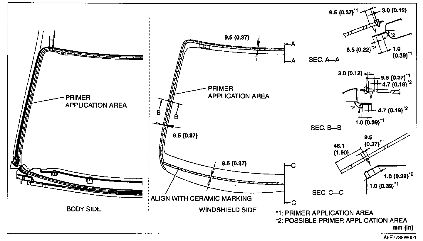 CAUTION: Keep the area free of dirt and grease, and do not touch the surface. Otherwise, the primer may not properly bond to the surface of the glass and body, which may cause leaks to occur.