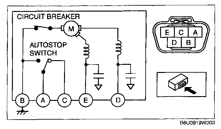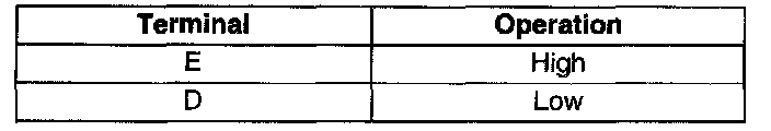 2. Connect battery positive voltage to terminal E or D and ground to terminal B, and inspect operation of the windshield wiper motor as indicated.